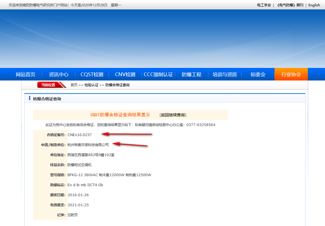 防爆合格證查詢步驟:首先登陸查詢網站,然后輸入合格證書編號,廠家名稱,點擊查詢即可查到防爆合格證資質信息。一般生產防爆產品企業(yè),取生產許可證,需要南陽電氣研究所頒布的防爆合格證。因此,現(xiàn)以南陽頒發(fā)的防爆合格證這個網站查詢?yōu)槭纠Ee例: 杭州特奧環(huán)保科技有限公司的防爆空調防爆合格證