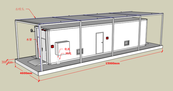 1、安裝基礎:箱體尺寸為12190*2350*2600mm,承載地基使用≧C25混凝土結構,尺寸為15000*4600*300mm,預留水、網線、主電源管道。